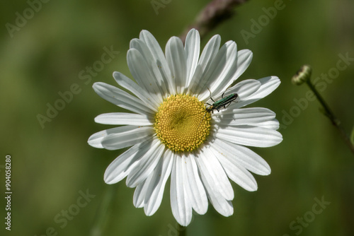 Obraz premium swollen thighed false blister beetle on a ox eye daisy flower with a blurred green background