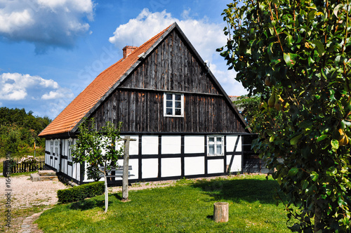 Fototapeta premium Swołowo - Malowniczy, tradycyjny dom z muru pruskiego otoczony bujnym...