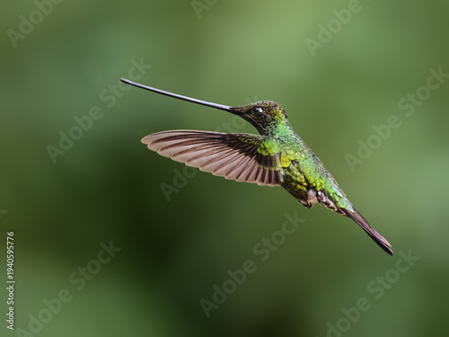 © FotoRequest, Fototapeta premium Sword-billed Hummingbird Hovering in Flight Against Green Background