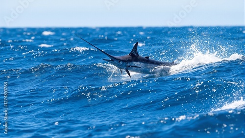 Fototapeta premium Swordfish slicing through ocean waves with bill aimed forward