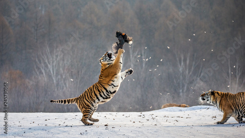 Fototapeta premium Syberyjskie tygrysy na śnieżnej polanie łapią swoją zdobycz. Bardzo dynamiczny strzał. Chiny. Harbin. Prowincja Mudanjiang. Park Hengdaohezi. Park Tygrysów Syberyjskich. Zimowy. Twardy mróz. (Panthera tgris altaica)