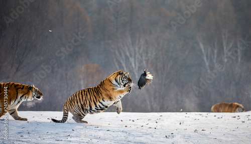 Fototapeta premium Syberyjskie tygrysy na śnieżnej polanie łapią swoją zdobycz. Bardzo dynamiczny strzał. Chiny. Harbin. Prowincja Mudanjiang. Park Hengdaohezi. Park Tygrysów Syberyjskich. Zimowy. Twardy mróz. (Panthera tgris altaica)