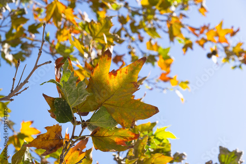 © mustafaoncul, Fototapeta premium sycamore tree branches and leaves in autumn