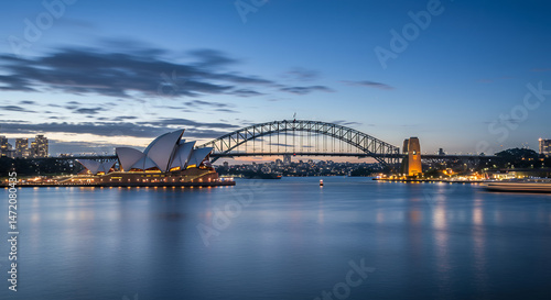 Naklejka premium Sydney at Dusk: Opera House & Harbour Bridge - Iconic Australian Landmarks in Evening Light