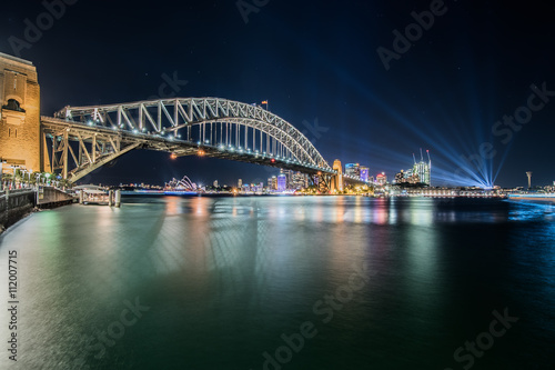 © pookrook, Naklejka premium SYDNEY, AUSTRALIA - May 29, 2016, Sydney skyline Vivid night view from Milson point illuminated with colourful light design imagery, during the Vivid Sydney 2016 annual public event.