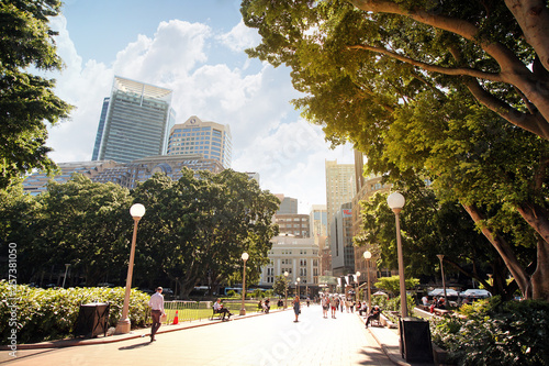 © Konstantin, Fototapeta premium SYDNEY, AUSTRALIA November 20, 2017: Sun rays on trees of Hyde Park, in the background the city skyscrapers. Tourists and residents walk in the park