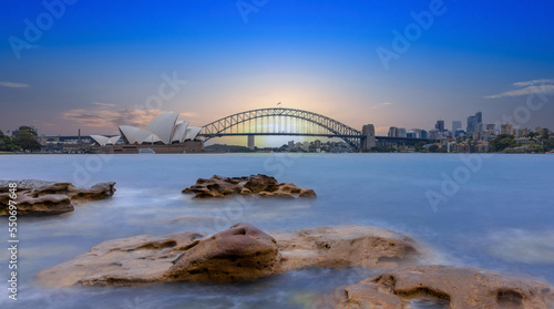 Naklejka premium Sydney Harbour Australia at Sunset with the turquoise colours of the bay and...