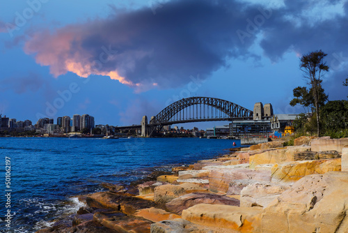 Naklejka premium Sydney Harbour Australia with nice colours in the sky. Nice blue water of the Harbour, high rise offices and residential buildings of the City in the background, NSW Australia