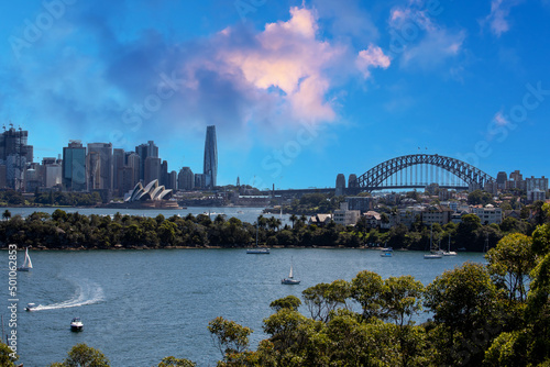 Naklejka premium Sydney Harbour Australia with nice colours in the sky. Nice blue water of the Harbour, high rise offices and residential buildings of the City in the background, NSW Australia