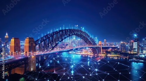 Obraz premium Sydney Harbour Bridge at Night with Digital Network Overlay and Cityscape