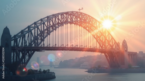Fototapeta premium Sydney Harbour Bridge at Sunset with Radiant Sunlight and Lens Flare Effect