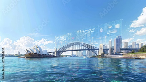 © Oleg, Naklejka premium Sydney harbour bridge in smart city concept integrating digital networks and infrastructure