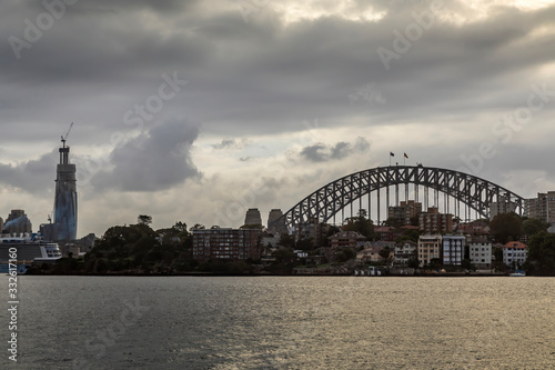 Naklejka premium Sydney in Australia, the skyline with the Harbour Bridge during a cloudy but...