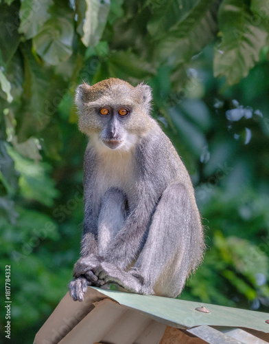 © Natalia Kuzmina, Obraz premium Sykes' monkey or Kolb's White-collared, or Samango Monkey (Cercopithecus mitis albogularis) looking from roof of the gate, Kwale county, Kenya