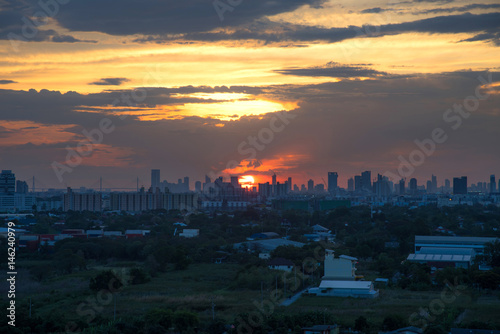 © mnonchan, Obraz premium Sylwetka budynku miejskiego i piękny zachód słońca w Bangkoku w Tajlandii.