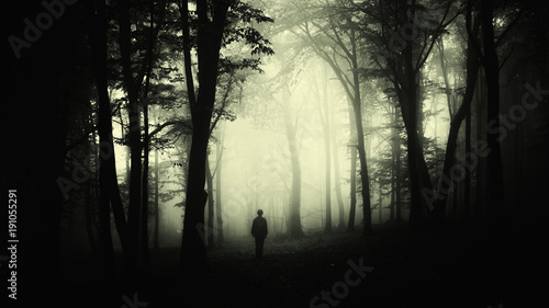 © andreiuc88, Fototapeta premium sylwetka człowieka wędrówki w lesie w nocy, ciemny straszny surrealistyczny krajobraz