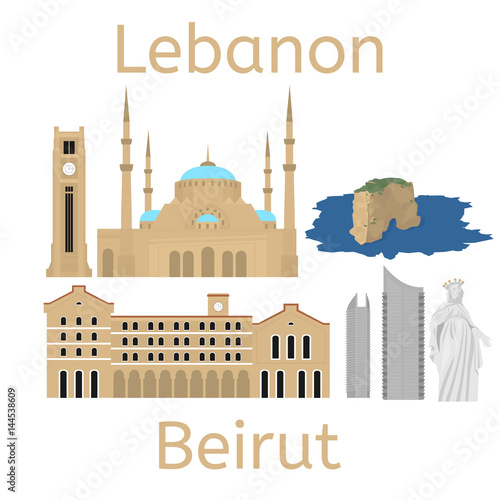 Obraz premium Sylwetka panoramę miasta Bejrut. Płaski baner ikony turystyki libańskiej,...