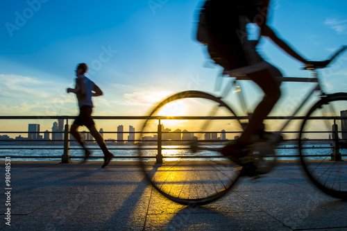 © lazyllama, Fototapeta premium Sylwetki biegacza i rowerzysta na rowerze o zachodzie słońca przed panoramą miasta