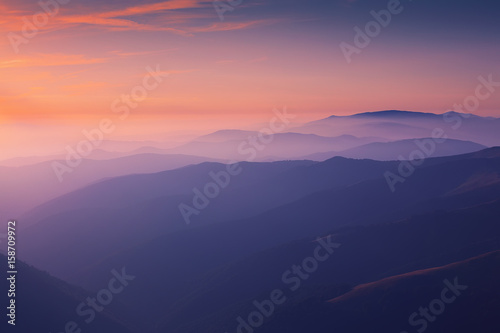© pilat666, Fototapeta premium Sylwetki górskich wzgórz o zachodzie słońca