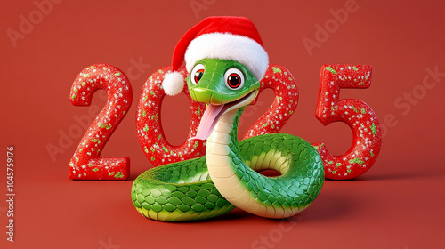 Fototapeta premium Symbol of the new year 2025, a snake in a Santa Claus hat. Red and green...
