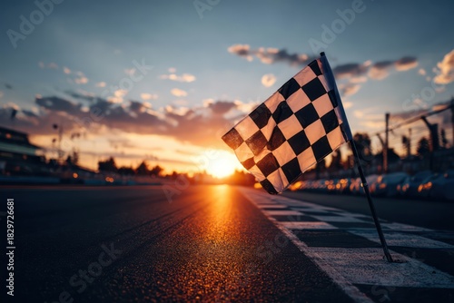 © Ольга Лукьяненко, Naklejka premium Symbol of Victory: Checkered Flag Against a Colorful Sunset Sky