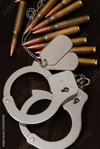 Naklejka premium Symbolic combination of handcuffs, tokens and bullets on a dark wooden background. Suitable for illustrating the concepts of war, peace, crime, punishment and defence.