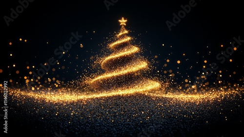 © Dushan, Naklejka premium symetrical christmas tree made from lines of gold glitter on simple black background