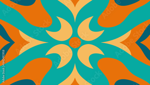 © Global, Fototapeta premium Symmetrical Abstract Pattern with Orange Teal and Beige Curved Shapes Keywords: abstract, pattern, symmetrical, design, graphic, art