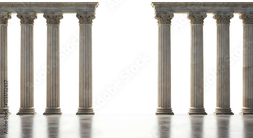© abu, Naklejka premium Symmetrical ancient Roman columns with ornate capitals on white glossy floor.