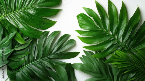 Obraz premium Symmetrical arrangement of lush green palm leaves against a white background....