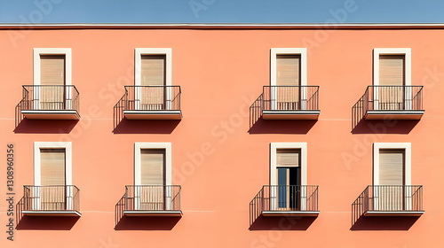 © Eko, Fototapeta premium Symmetrical Arrangement Of Windows And Balconies On A Pink Building Facade