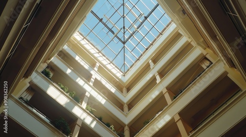 Obraz premium Symmetrical atrium with natural light filtering through a glass roof