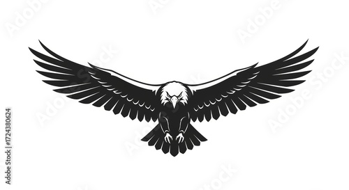 © HapeTany, Obraz premium Symmetrical Black and White Soaring Eagle with Fierce Gaze, a Powerful Graphic Emblem.