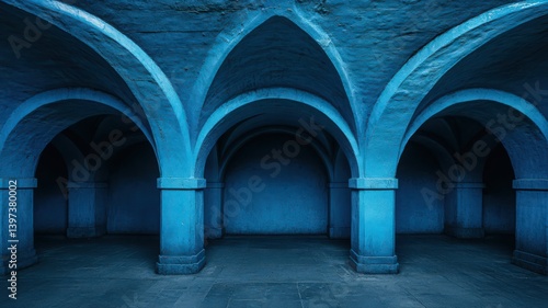 © Yopi, Fototapeta premium Symmetrical Blue Stone Arches in Underground Tunnel Featuring Rows of Vaulted Columns Old World Architecture and Textured Walls