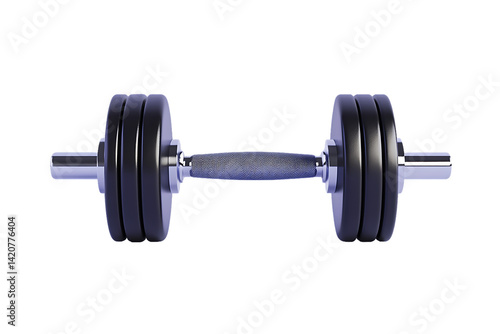 Fototapeta premium Symmetrical dumbbell with black plates and textured handle, isolated on white.