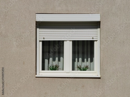 © Miki, Fototapeta premium Symmetrical elegance. White blinds, window curtains and flower pots. Light and shadow. Pattern and texture. Wall background.
