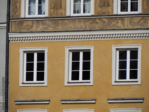 © Олексій Остистий, Obraz premium Symmetrical facade of a yellow historic building featuring four rectangular windows with white frames in Warsaw Old Town.
