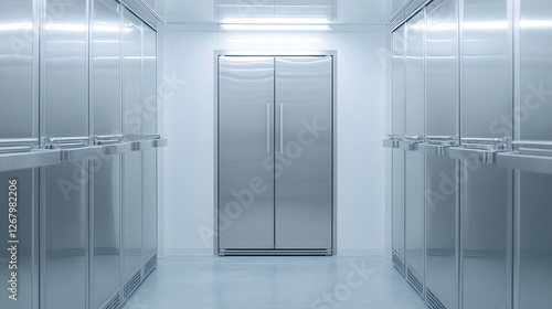 © A2Z AI , Naklejka premium Symmetrical fridges and freezers create a clean, minimalist aesthetic in a sterile environment. Bright, uniform lighting highlights the stainless steel.