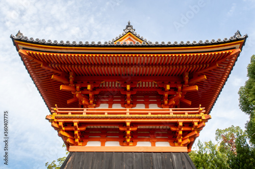 © Cleop6atra, Naklejka premium Symmetrical front view of traditional orange wooden Syoro Pagoda with carved roof in Ninna-ij Temple in Kyoto, Japan, with blue sky in the background, autumn.