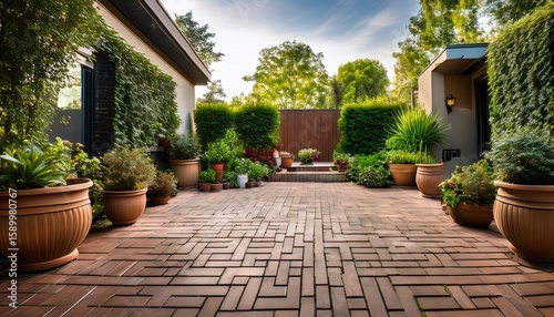 Fototapeta premium symmetrical front yard garden with potted plants vibrant greenery and serene...