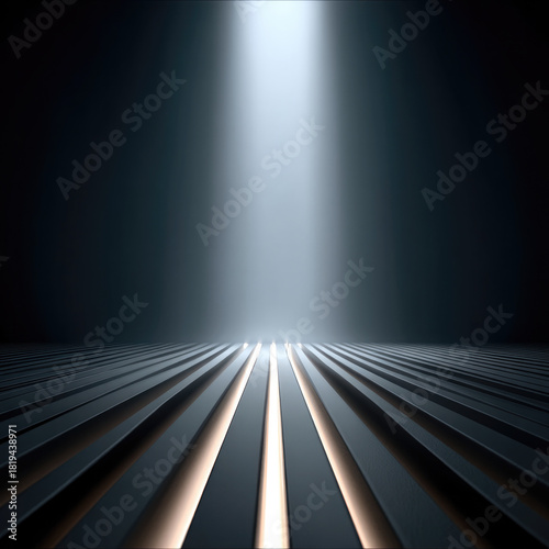 Fototapeta premium Symmetrical futuristic background with dramatic light beam, metallic floor, abstract lines, modern minimal design, mysterious atmosphere