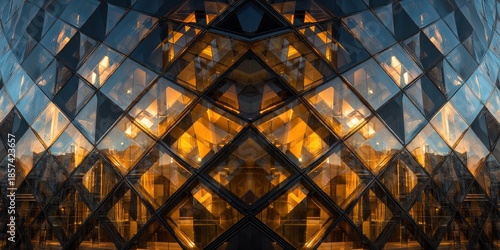 Fototapeta premium Symmetrical Geometric Glass Facade with Warm Orange Light Reflections