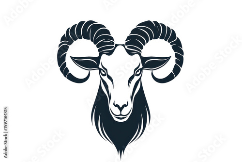 © Atonu, Fototapeta premium Symmetrical goat logo with curled horns, white background in silhouette .