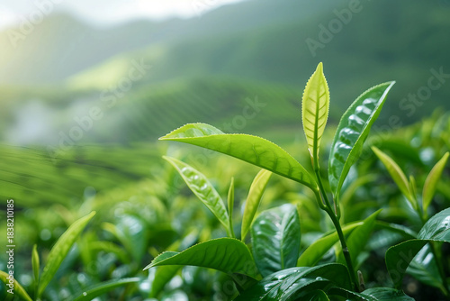 © Tetiana, Obraz premium Symmetrical green tea bud and fresh leaves on tea plantations, generative ai