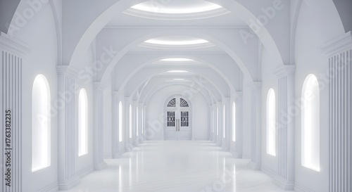 © DelishVibe Studio, Fototapeta premium Symmetrical modern hallway architecture illuminated with ambient light perspective architectural design
