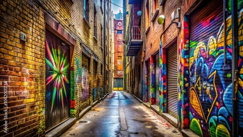 Fototapeta premium Symmetrical narrow alley with graffiti wall