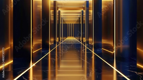 Obraz premium Symmetrical perspective of modern corridor with glowing gold and blue lights