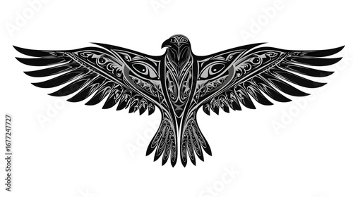 © Shariful, Obraz premium Symmetrical Raven Design with Intricate Tribal Patterns for Artistic Projects and Decorative Purposes on Clear Space
