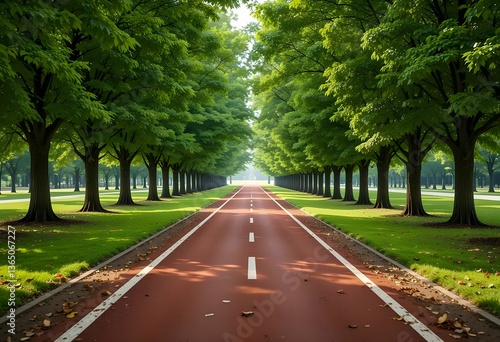 © Thebro , Fototapeta premium symmetrical red running track with tree-lined sides
