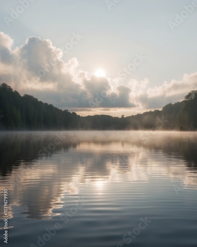 © DEER FLUFFY, Fototapeta premium Symmetrical Reflection of Lake with Clouds and Sunlight.